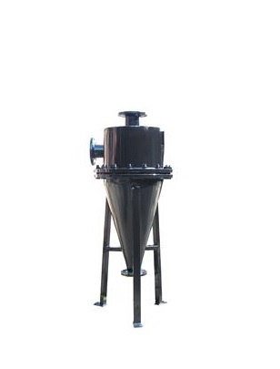 旋流除砂器是根據離心沉降和密度差的原理,當水流在一定的壓力從除砂器進口以切向進入設備后,產生強烈的旋轉運動,由于砂水密度不同,在離心力、向心浮力、流體 力的作用下,因受力不同,從而使密度低的清水上升,由溢流口排出,密度大的砂由底部排砂口排出,從而達到除砂的目的。在一定范圍和條件下,除砂器水壓力越大,除砂率越高,并可多臺并聯使用。